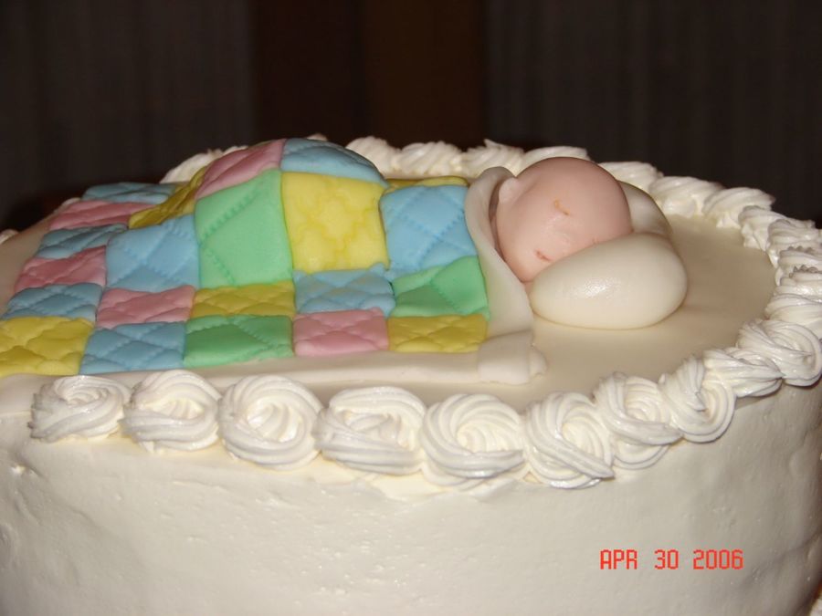 I made this cake for my husband's nephews baptism. The baby and blanket are made out of fondant. I had so much fun sculpting the head and body. The blanket is what took the longest time. Cake is french vanilla with strawberries in the center. Extra special buttercream tops it off.