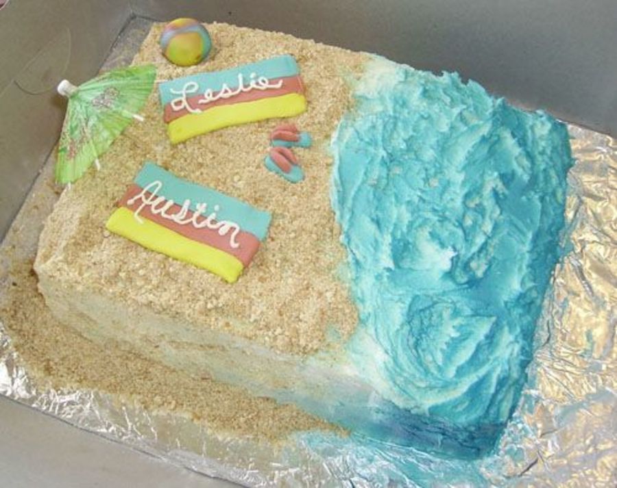 Made this one just a little while ago using ideas from all you folks! Sandals, towels, and ball are all fondant. Sand is vanilla wafers and brown sugar. Ocean is airbrushed.