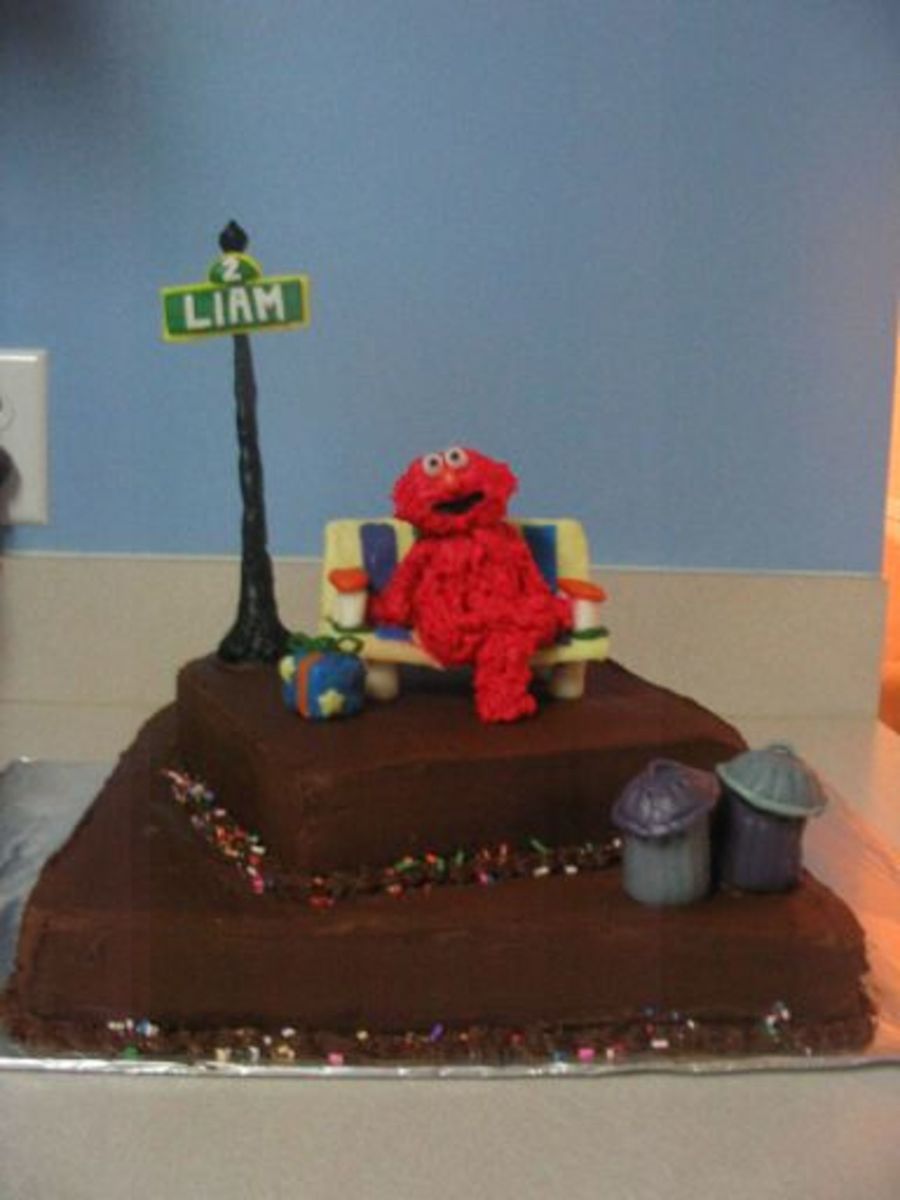 This was a dark chocolate cake with dark chocolate buttercream frosting. Elmo is made from rice crispy treats then frosted. Everything else is made with MMF. By the way, one leg is up on the other - it's a bad pic!