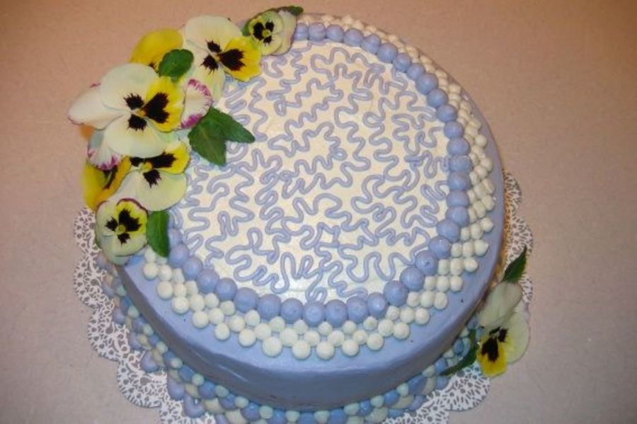 Fudge Cake torted with Creamy vanilla, bc icing, Cornelli and pearls. Fresh pansy spray.