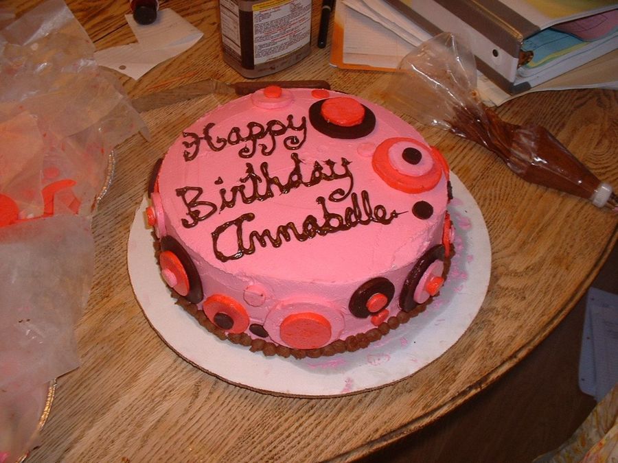 This was a chocolate cake covered with pink buttercream for a friend who really likes the 60's mod theme. The "mod" designs are buttercream circles that I spread flat on wax paper, froze, cut out w/ circle cutters, and then placed on the cake. I could have made them out of fondant, but I wanted to try something different! Thanks for looking!
