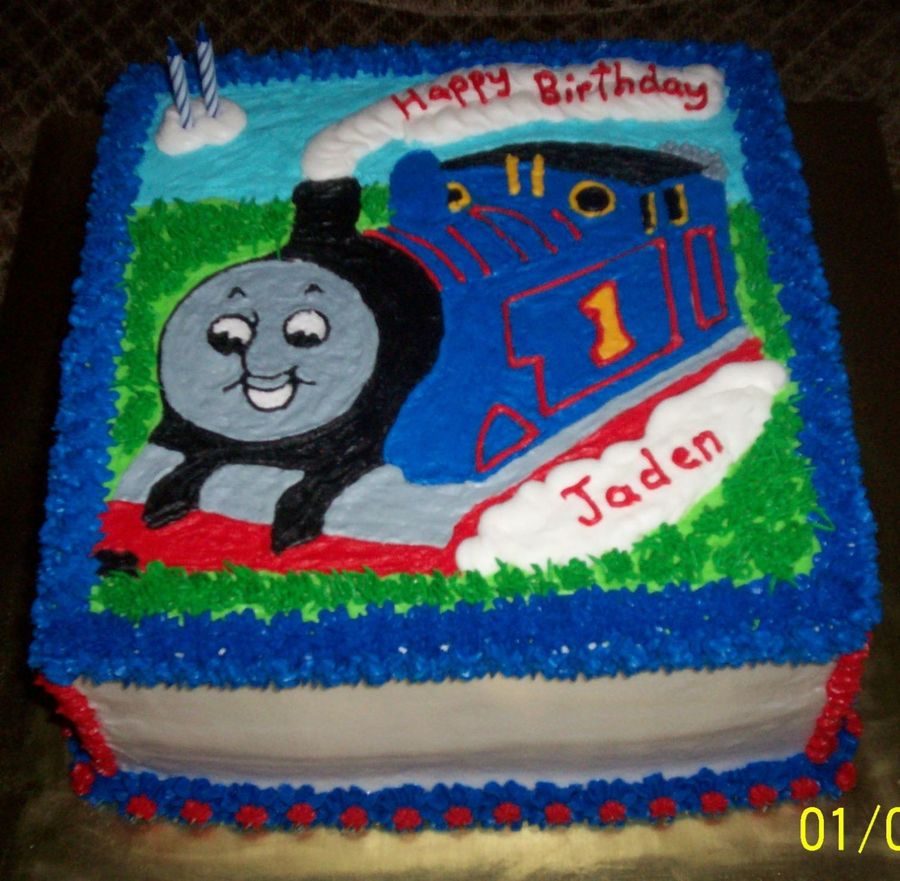 The Thomas on this cake comes from a coloring page. After tracing him onto the cake, I filled him in using buttercream icing and a firm paint brush.
