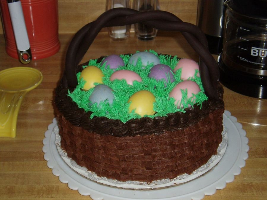 Chocolate cake with hot fudge filling and chocolate BC icing. Eggs are colored almond bark, and handle is chocolate clay.