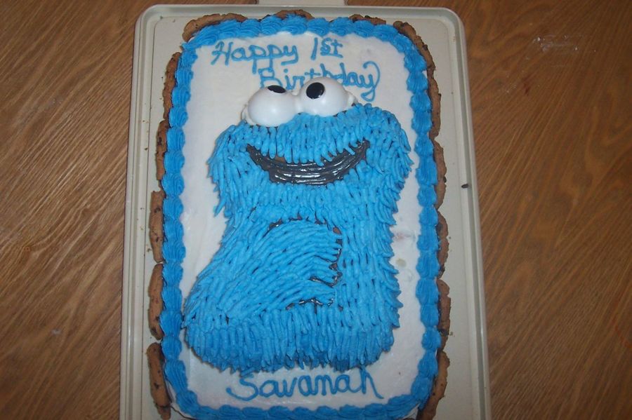 I made this cake for my cousin's little girls first birthday. The cake is decorated with buttercream icing and the sides are covered in chocolate chip cookies. She loved it.