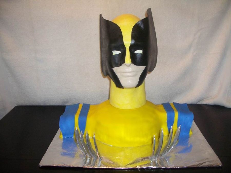 Cake shoulders covered with fondant. Wolverine's head is a man's styrofoam head painted with glow in the dark paint and sheet foam cut out for his mask. Wolverine's head glows in the dark through his mask! Claws are carved and painted to look like the knives coming out of his fists. My 8 year old nephew was the envy of the party!