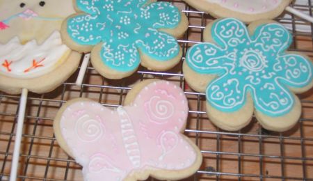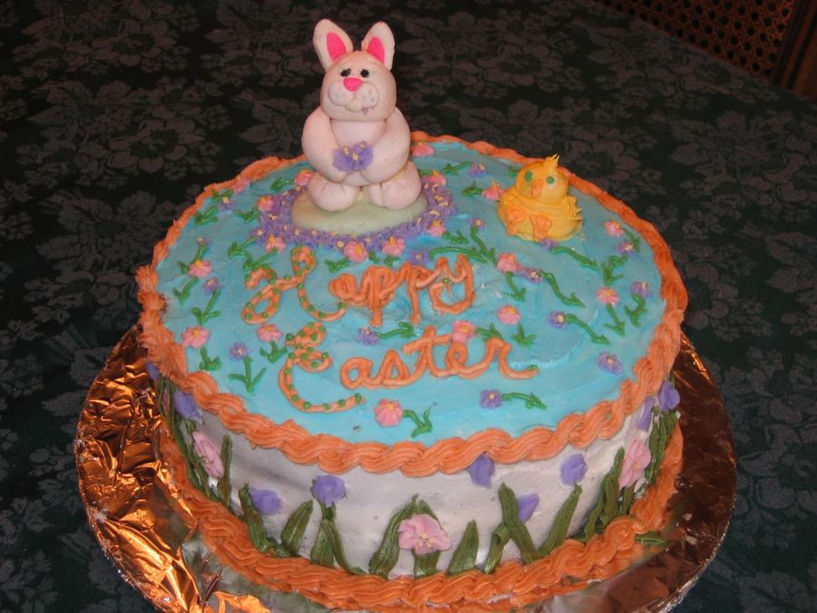 Darn-good chocolate cake, strawberry/creamcheese filling. Fondant rabbin, piped chick.