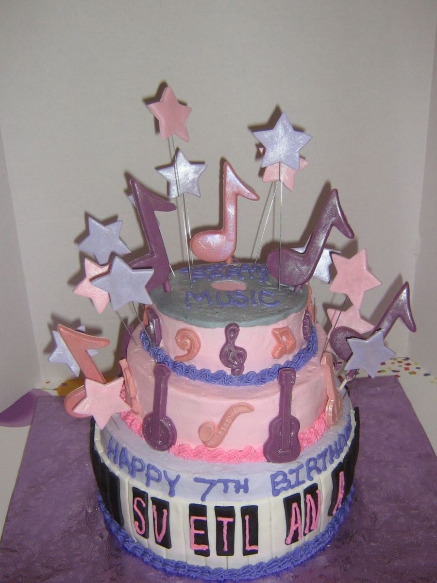This is was made for a little girl who loves music. I have never had someone love their cake this much, it made my heart flutter with joy :). The instruments are candy molds and the stars and piano keys are mmf. I dusted petal dust for the shimmer effect. Thanks for looking :)