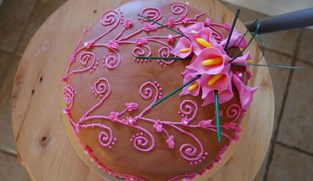 Filled with strawberry cream, chocolat mousse and vanilla cream. The design is from a cake that somebody showed a picture of here at cake central.