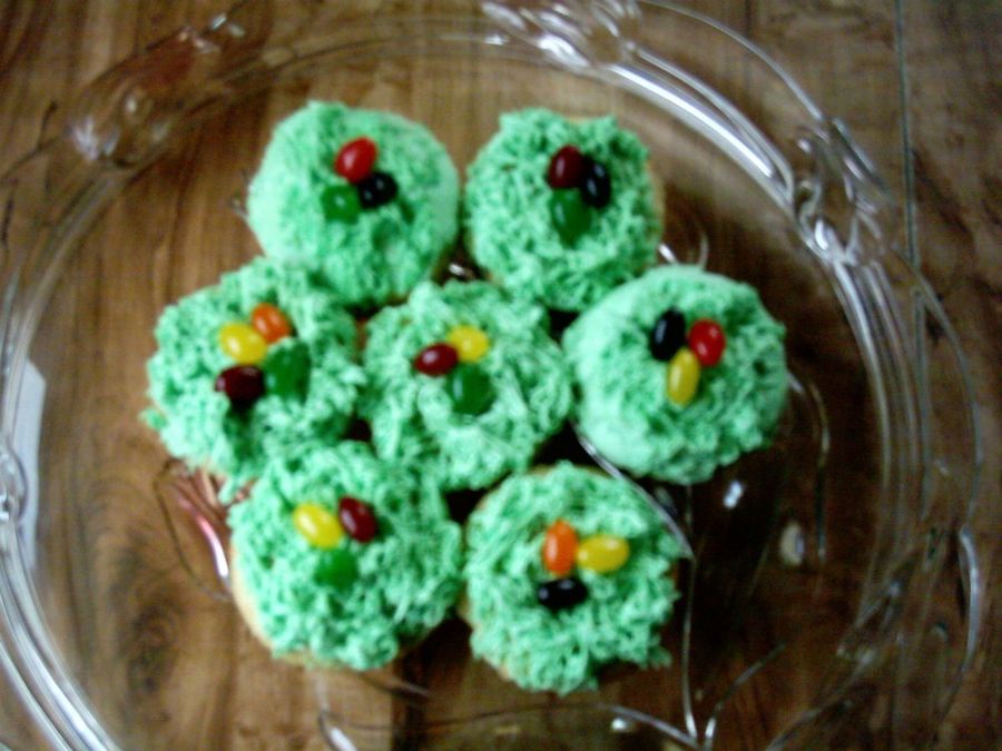Almond cupcakes with Buttercream Icing and Jelly Beans. Thanks to vixterfsu for the idea of how to make grass without the 233 grass tip!