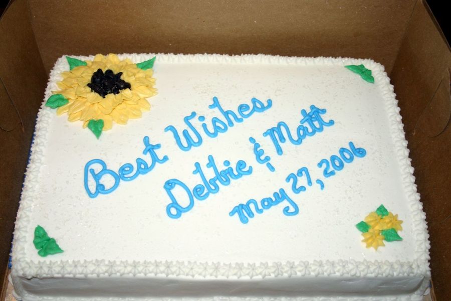 A very simple shower cake with buttercream icing. The hostess requested a sunflower and blue writing. The center of the sunflower is made up of chocolate chips.