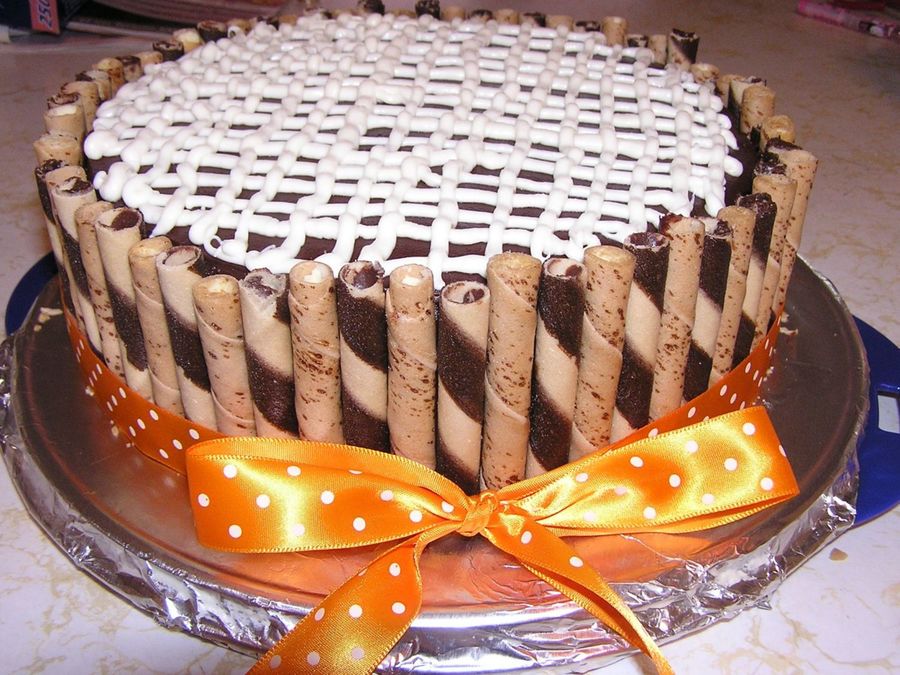 chocolate cake with a white chocolate cream filling, covered in chocolate ganache, and decorated with chocolate and vanilla piroulines, and a ribbon.