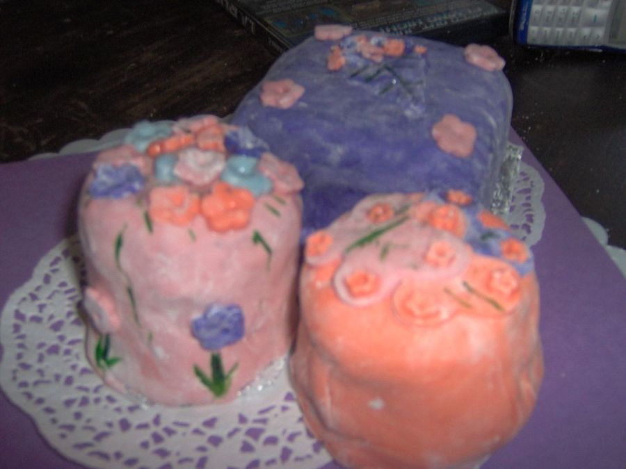 These are all chocolate cake frosted with a buttercream undercoat and marshmallow fondant on top. This is my second attempt at miniature cakes and my second attempt at mmf. Please let me know what you think. I still have a lot of practicing to do.