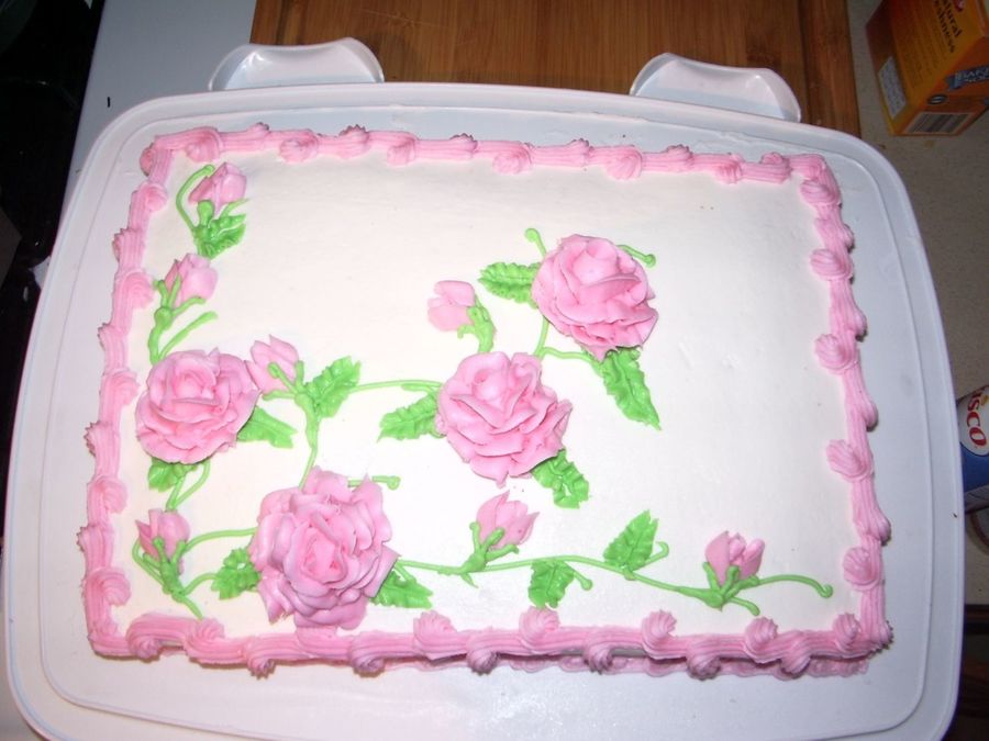 I figured out the reverse shells! Much easier on a square cake. First ever try at roses, they need some work but I'm pleased. By the time I got to them my icing was way too soft. Sweet peas turned out pretty good. Overall I'm happy with my final cake, and I can't wait to practice those roses some more!