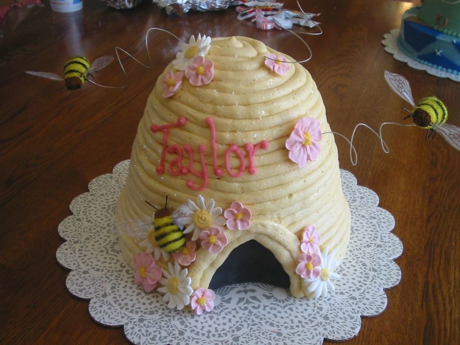 Thanks for all of the comments! I used an 8" pan on the bottom and a Pampered Chef big batter bowl for the top. I was running short on time, so I bought some bees from a craft store.