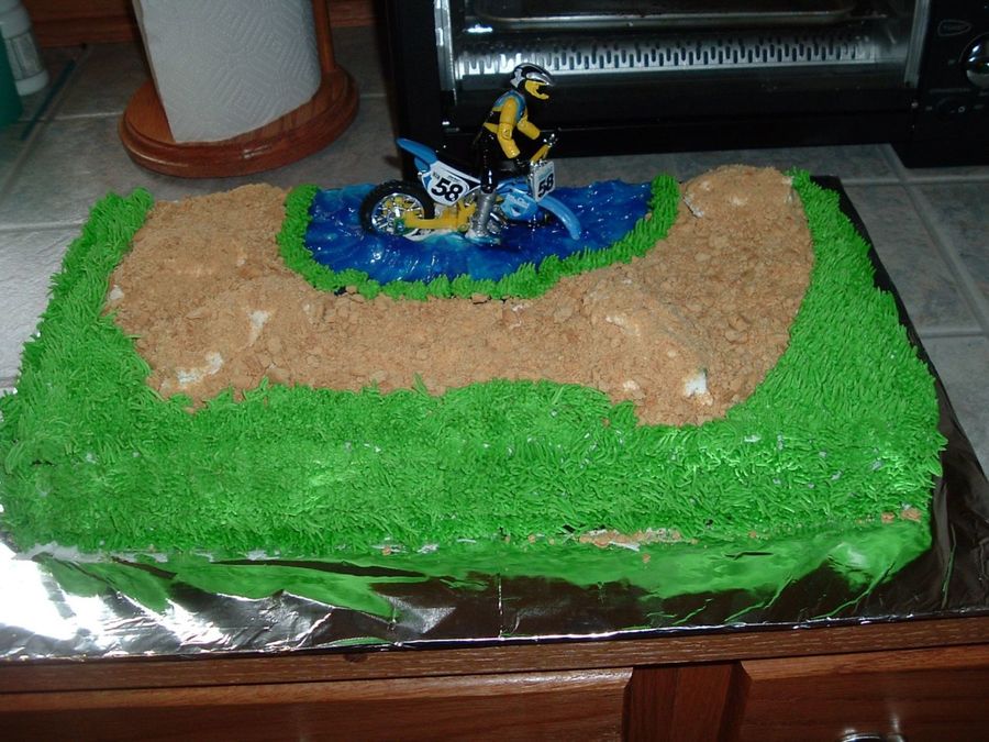 This cake I made for my DH. He went to a guys day out riding 4 wheelers and dirt bikes. He is suppose to bring a dessert, so he asked me to make a cake with a dirt bike in the pond. His friend put his bike in the pond one day. So my goofy husband wants to be a sh** and tease him. Chocolate cake with BC icing. The dirt track is graham cracker crumbs. The bike is actually a toy.