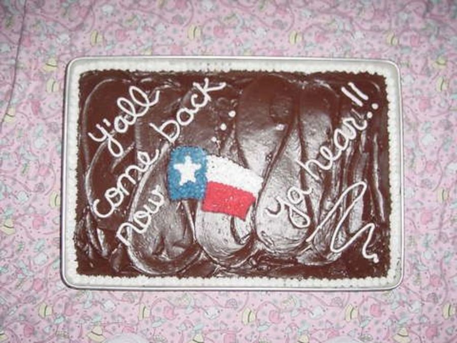 This cake was yellow cake with chocolate & BC icing. This was made for my best friend when she & her family were moving from Texas back to California. This cake barely survived the heat at a picnic on a hot July day at the park!!!