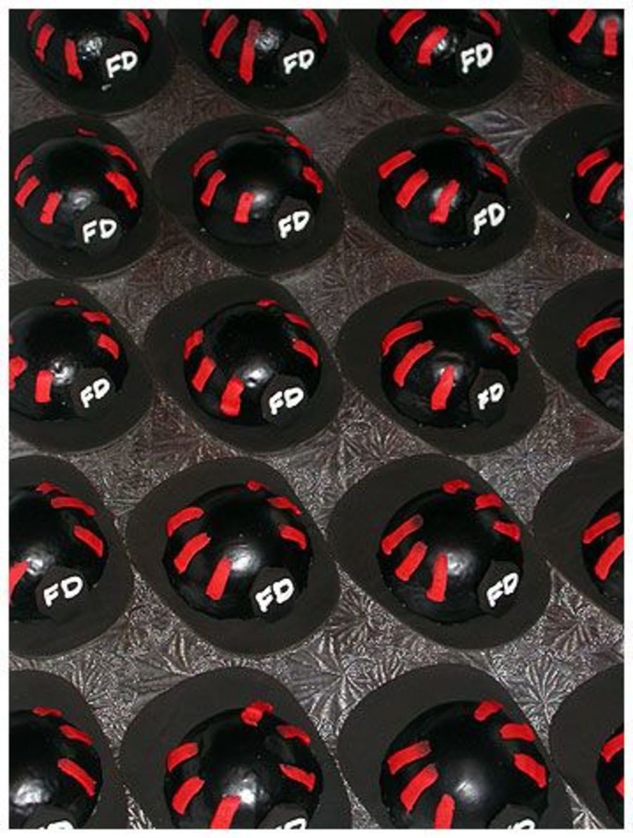 I made 25 of these individual fire helmets to go with the last fire truck cake I did. Baked in the mini ball pan, covered with poured fondant. Base and plaque are fondant, made ahead and let dry.