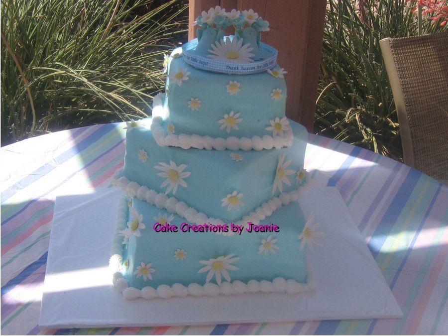 Buttercream with gumpaste daisies. Gumpaste booties plaque.