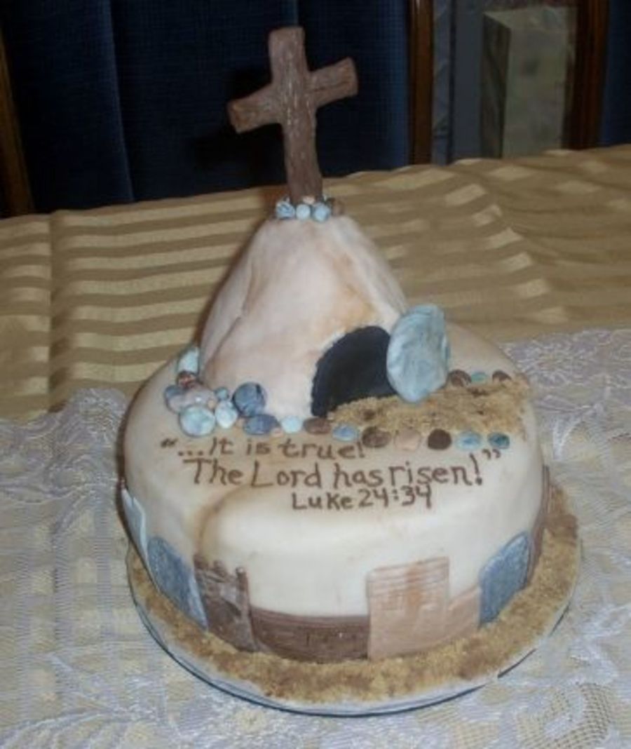 I was looking for something different to make for easter and came across this idea somewhere online. The cake is lemon poundcake w/white chocolate and rasberrry filling. The tomb is rice crispy. Most of the stones I just made with fondant. I rubbed cocoa on spots to make dirty looking. The cross I made w/ melted choc.