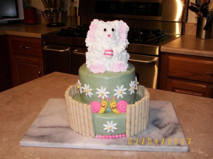 Vanilla cake with raspberry & chocolate filling, iced with buttercream, fondant accents & piroutte cookies. The bunny was made with the mini bear pan, he just got fluffier & fluffier lol. Lots of fun and a hit with the kids :)
