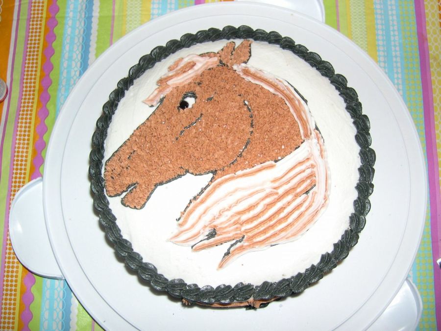 cassi_g16 says: "What tip did you use to make the mane? You did a very nice job on the horse I love it!" I used the star tip. I filled one side of the icing bag w/ white icing, and on the other side I used brown. I then turned the bag, so that when I squeezed the bag, both colors of the icing would show.