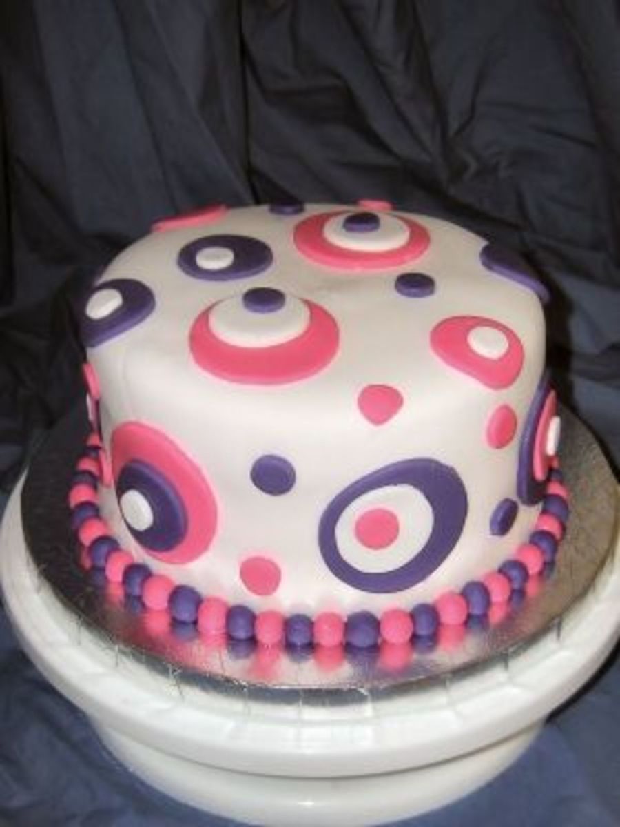 6" French Vanilla cake filled and iced with buttercream. Covered in fondant with fondant cirlces and balls. I made this for my sisters 27th birthday.