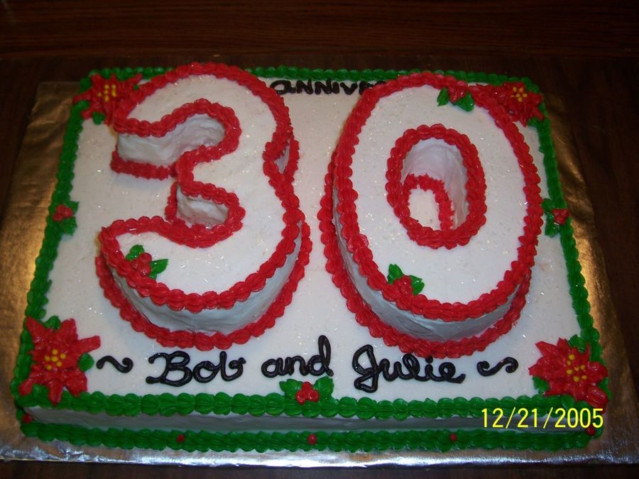 1/2 sheet with 30 cut out of oval pans, frosted in buttercream with white cake sparkles on the 30