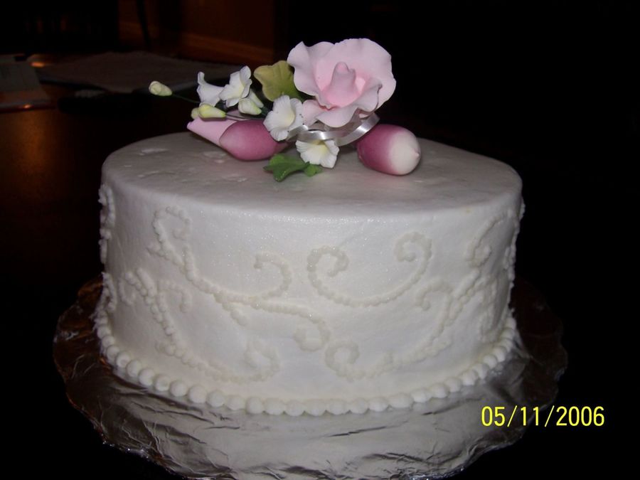 Butter cream practice cake. Used Wilton scroll impression kit (pushed too hard). Purchased gumpaste topper (I'm taking the gumpaste course next month!).