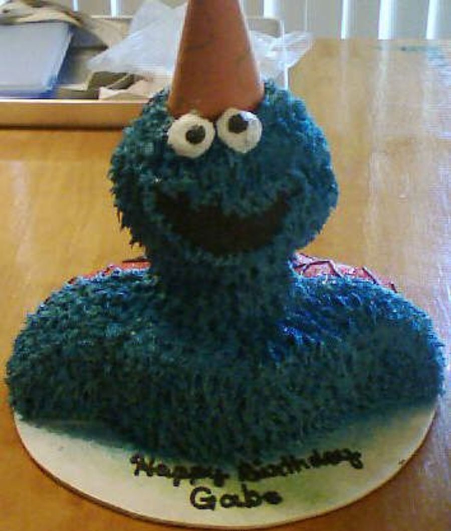 This cake was inspired by a few that I have seen on here. My 2 nephews share a birthday......although one is 6 and his brother is 2! So I decided to make a cake that would appeal to both of them. On one side is the Cookie Monster, the other side is spiderman. The party hat is on there because I couldn't get my hands on a wig head, (I had to make my own of styrofoam ball and cone) so the head kept wanting to fall off so I used a metal rode and had to hide it with a hat at the last minute. LOL