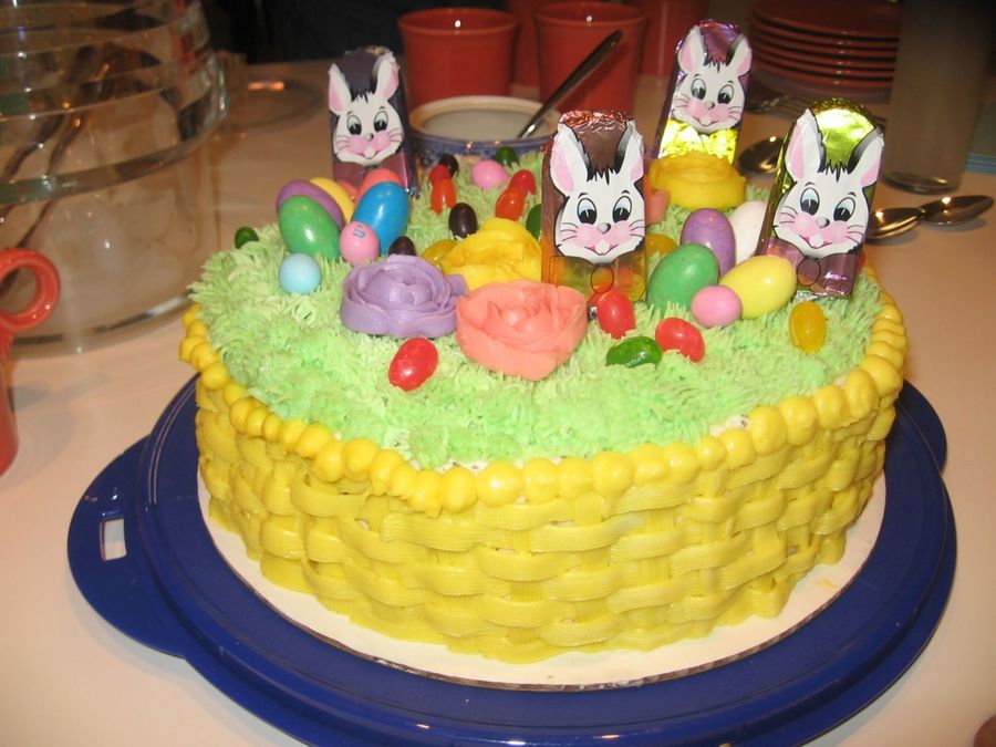 This was really fun to make! Chocolate cake with raspberry filling...my first try at a basketweave and making grass. My cousin of course had to stick her fingers in the icing, thats why its a little messed up in front.