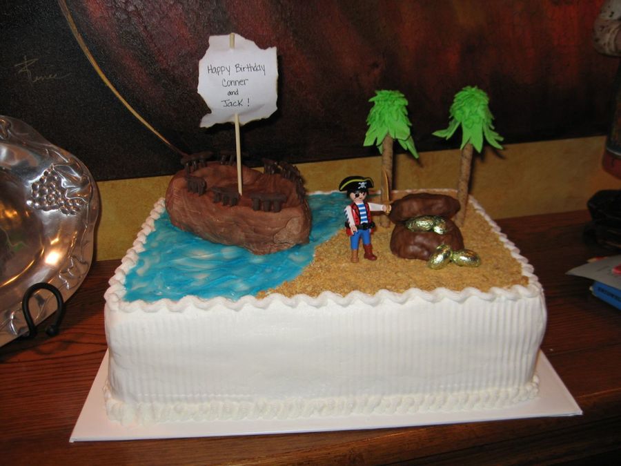 I made this cake for a little boy who turned 5. I was inspired from one of the cakecentral members. The ship and treasure chest were molded out of rice crispy treats and covered with chocolate fondant. For the water, I tinted clear piping gel, blue and the beach was made with crushed up graham crackers.