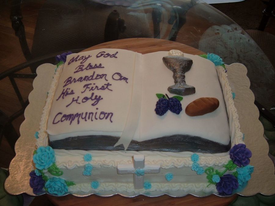 The cake is vanilla butter cake with white chocolate buttercream icing. The filling is half choc and half vanilla pudding. The bible cake is covered in mmf, the grapes and bread are mmf. The cup, communion wafer, and cross are all white chocolate.. The roses are royal icing roses.. i got this idea from the many bible cakes in the website.. Thanks!