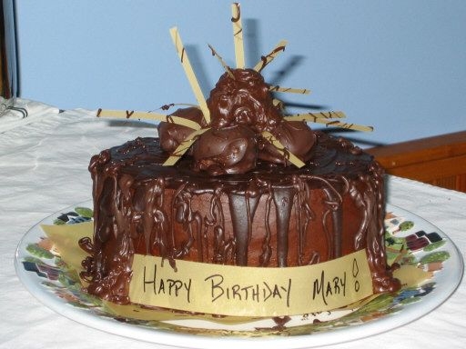 Chocolate fudge cake, chocolate frosting (the Chocolate Syrup Recipe - LOVE IT), chocolate ganache (Recipe I) covering on top, with cake truffles and melted chocolate drizzled all over. The gold is vellum sparkling paper. For our dear friend and neighbor who loves chocolate more than anyone I have ever met (even me)!