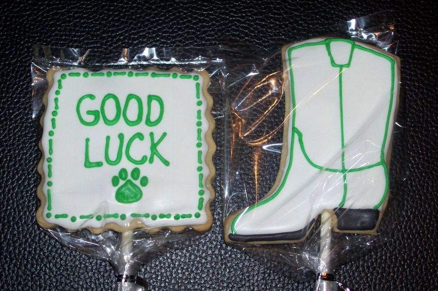 These were made for Drill Team try-outs--modified cowboy boot cookie and a good luck cookie with mascot paw on it.