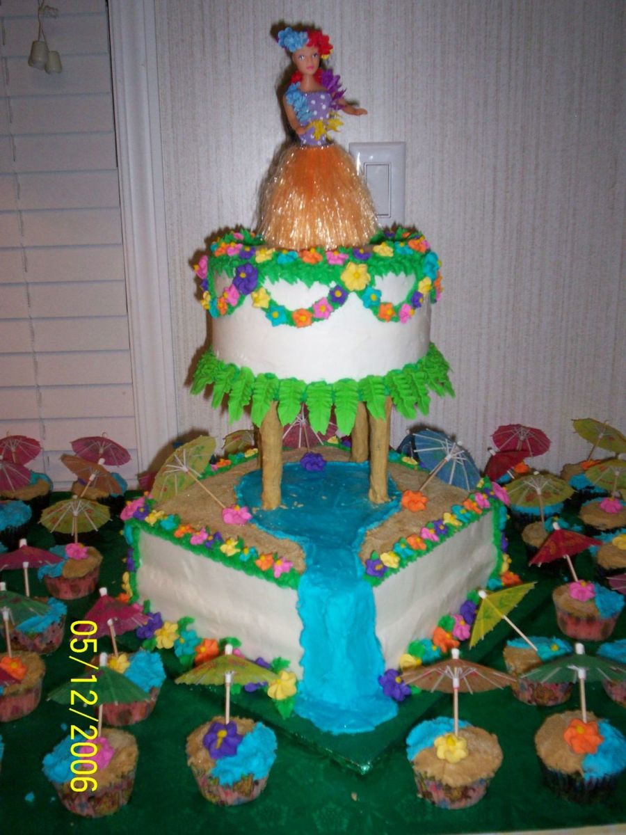 This cake was for my best friend's daughter. Each year she has a luau party for her birthday. The bottom cake is a 10" square - white cake with lemon filling. The top cake is an 8" round - strawberry cake with strawberry filling. The cupcakes are chocolate. Royal icing flowers and leaves. The columns is iced in buttercream to resemble tree trunks.