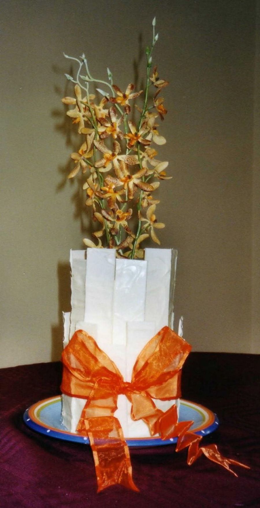 2-tier cake covered with white buttercream, then I used white chocolate strips to cover the sides. The flowers are silk flowers