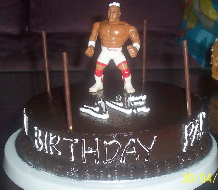 Made this for my dad's 75th Birthday. He loves wrestling so much that gave me the idea for this cake. Chocolate sponge with chocolate ganache. 4 poles were Glico biscuit. Wrestler is one of my son's toys... hahahaha