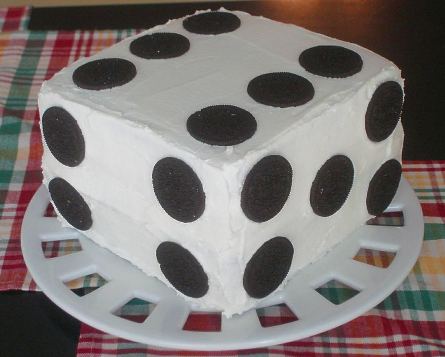 I made this last Monday for Bunko night at my house. Thanks to "Rainbow" here at CC for the inspiration. :) Everyone loved it! It was 4 layers (alternating choc/vanilla) with chocolate BC frosting sprinkled with crushed Oreos in between. Covered in white BC with Oreos as the dots on the dice.