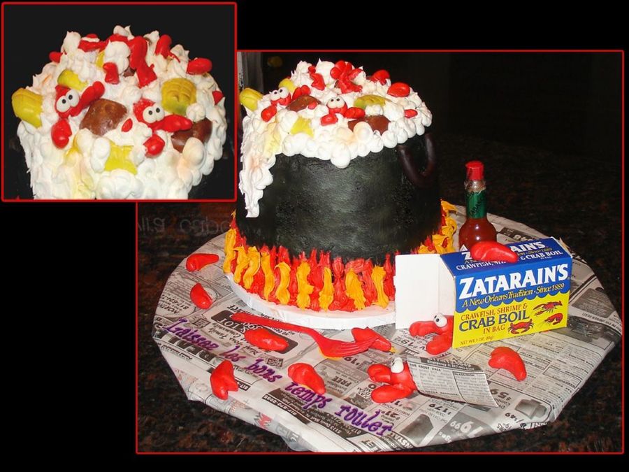 Adorable! I love the use of the zatarain's box, newspaper and other accents (in addition to the obvious cuteness of the cake itself. Your crawfish are so great!
