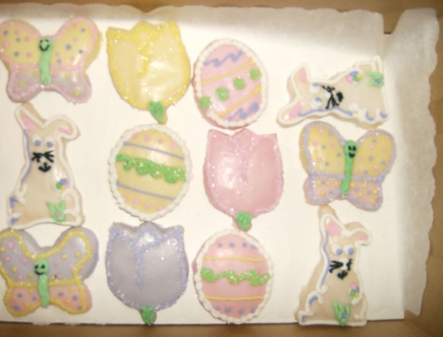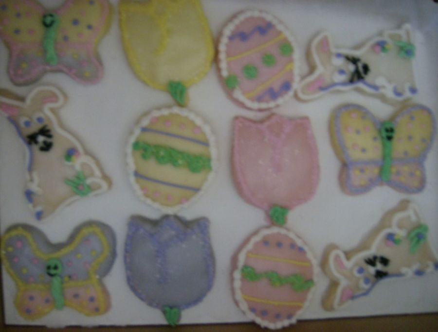 I think we made about 8 dozen of these darn things, i'm sick of cookies.Lol. It's just a simple sugar cookie and dipped in RI and all are decorated in BC, some have colored crystal sugars.