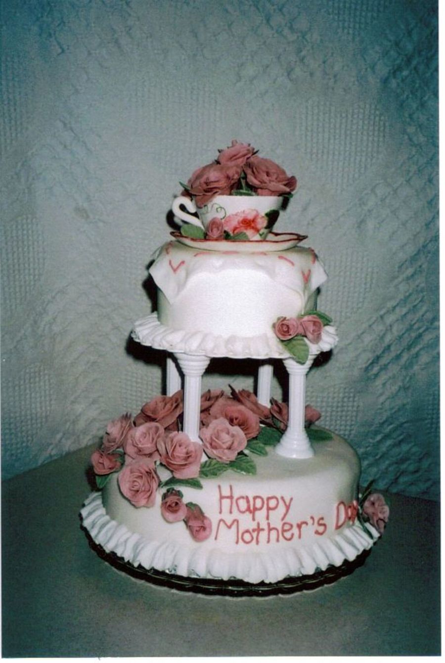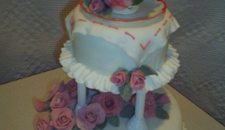 White cake with strawberry cream filling and covered with fondant. Cup, Saucer, and roses made of fondant. Cup details are painted on. Ruffle and lettering is buttercream.