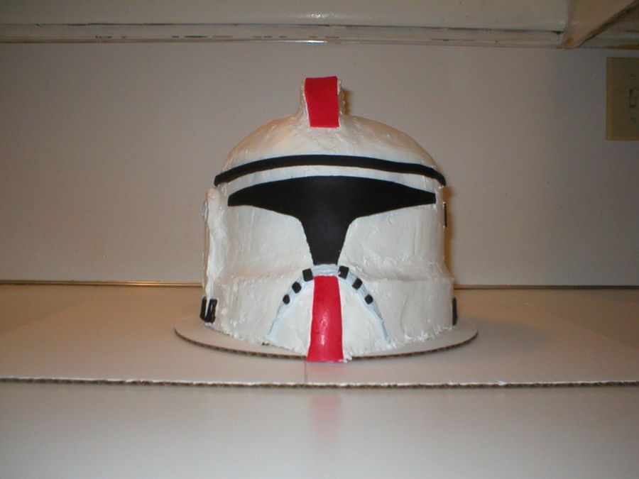 We made this 6 layer cake for my son's 8th B-day. We used 6- 8in layers and carved it into the shape of the helmet and rice crispy treats for the top, side and front of the helmet. We used frosting (it was really hard to get smooth with the shape of the cake, but it tastes better than fondant --in my opinion) and fondant for the rest of the details.