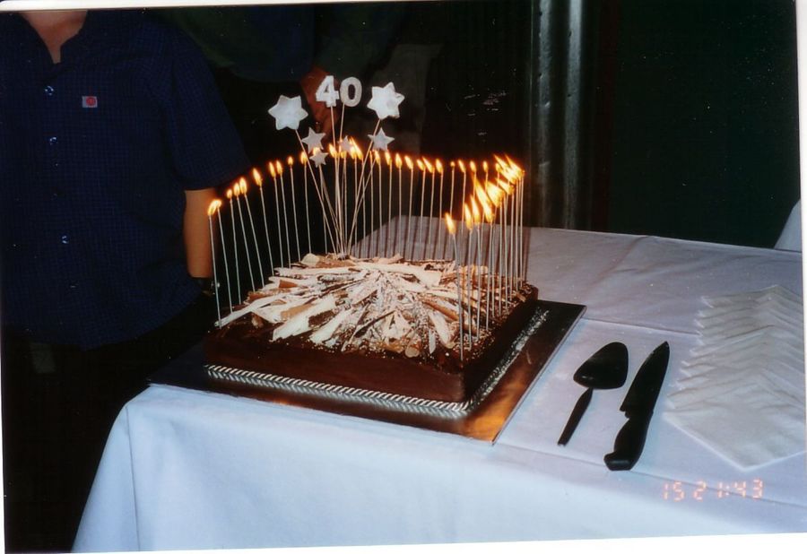 Made for my BIL, all covered in ganache, chocolate caraque (milk, white & dark chocolate), and 40 small skinny candles sprayed in silver.