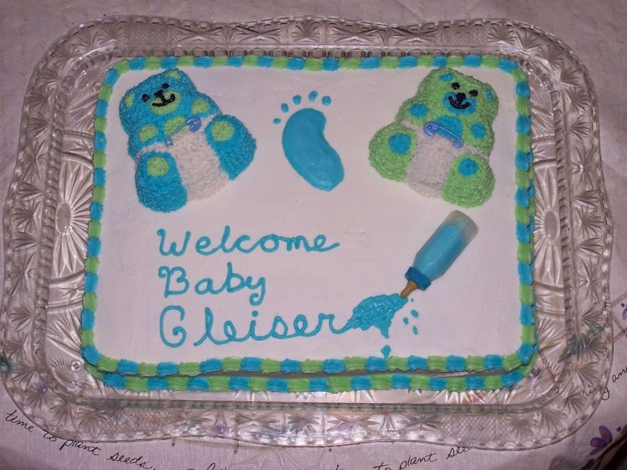 This is a homemade chocolate cake with buttercream frosting. I used the small teddybear pan to make the two bears and put them in diapers, and made it look like the writing was done with a small baby bottle filled with frosting. This is what happens when someone tells you to make them a baby shower cake and to do whatever you want.