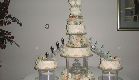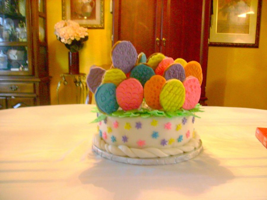 This is a easter basket cake. I made the handle. but the handle broke apart. The cake is a yellow cake with strawberry filling. iced in BC covered in MMF. The "eggs" are sugar cookies iced in BC and covered with MMf and mounted on top of cookie treat sticks with candy melts. The leaves ,stars and bottom border are MMF. next year i will make a stronger handle.