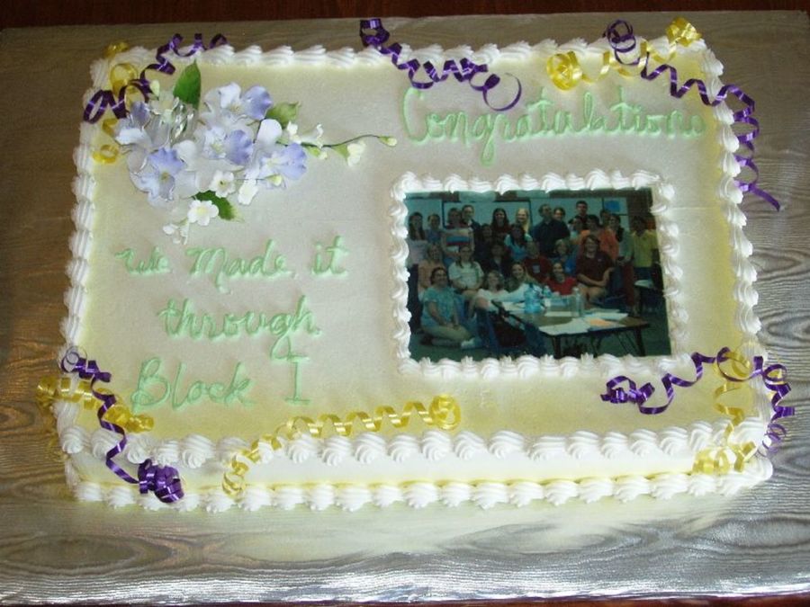 I had to throw together a cake for school tonight... It took me an hour from start to finish. It's chocolate cake with cookies and cream filling and whipped icing. The flowers are premade gumpaste and I airbrushed the the perimeter of the cake with yellow, but the flash washed it out. I'm going to school to become a teacher and this cake is to celebrate completing the first block in the program. Three more blocks and I'll be teaching..YeeeHaaa!!!