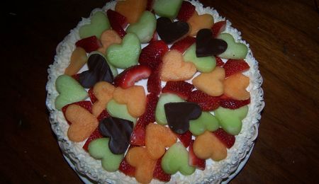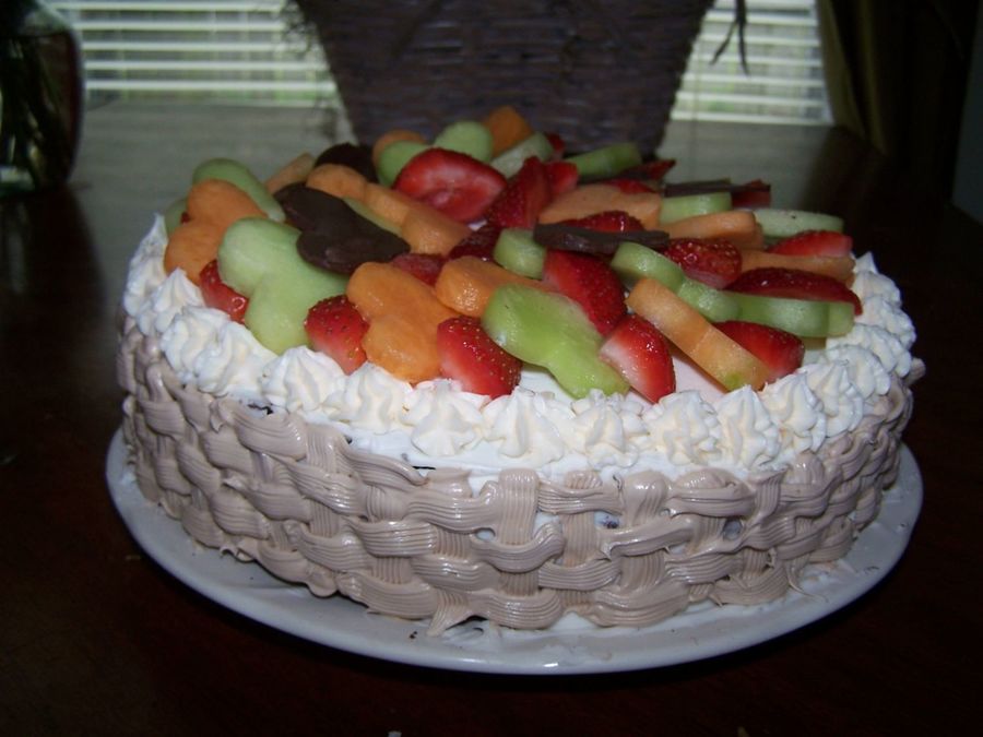 This is only my third cake. It's a bit lopsided but I thought the fruit turned out nicely. I did use store bought icing because I was short on time. You can tell it was a little to warm. I won't use store bought again. It seemed to heat up in my hands too fast! I was constantly cooling the piping and the icing.