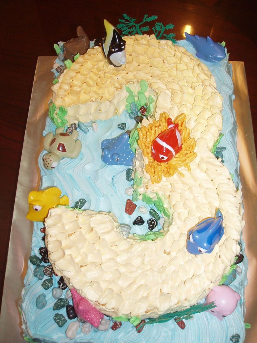 My nephew turned 3 last weekend, so I decided to bake him a nemo cake decorated with all the toy stuff so that he could play with them later. The 3 was a carved chiffon cake and the bottom is a sponge cake. Once the candles were blown, the fish quickly disappear one by one. We had great fun.