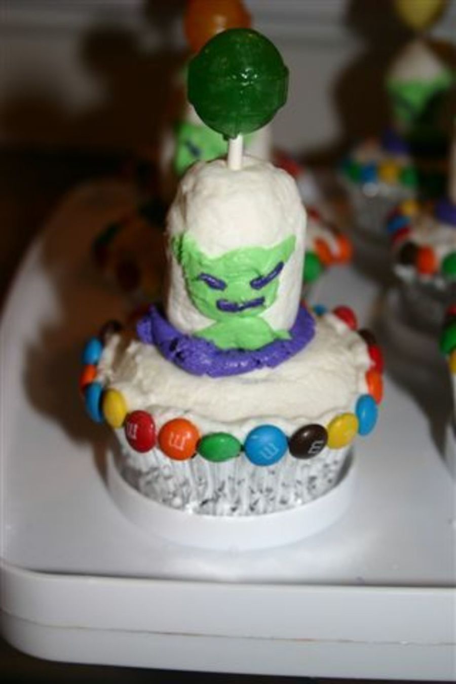 These were fun! They were filled with nerds candies. Marshmallows with frosting on top. M&Ms for lights, dum dum on top. Idea from the Wilton website.