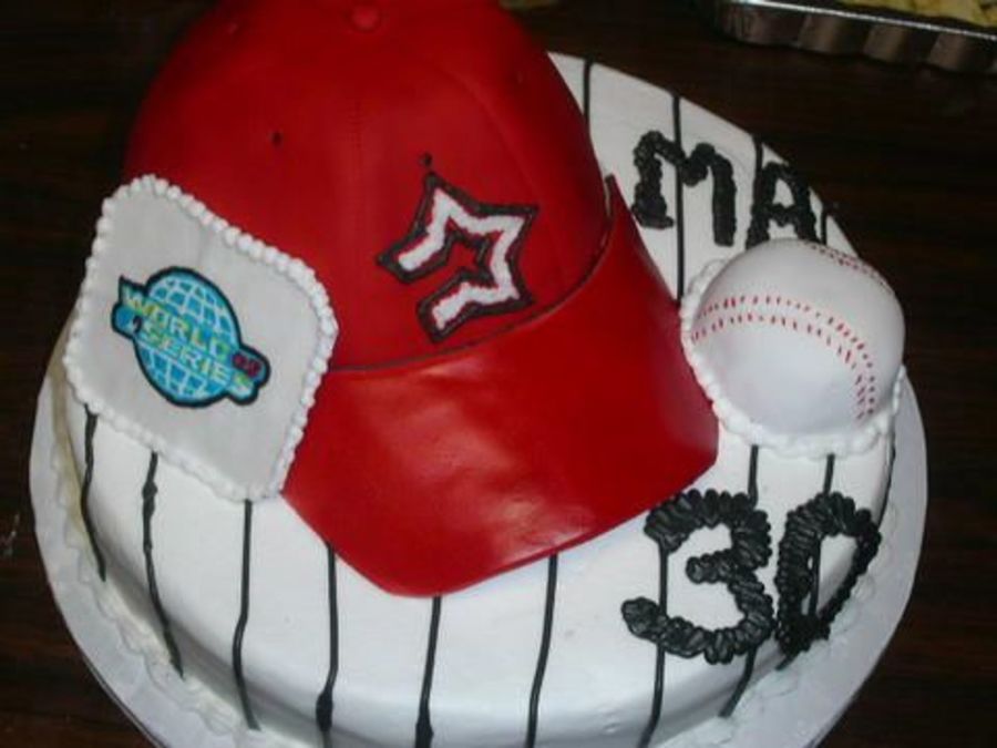 Regular sports ball pan. covered in fondant, brim was fondant/gum paste made in advance using a brand new, never worn hat wrapped in a plastic bag. Just let it dry. I airbrushed it to get the red so bright - patiently, allowing time to dry between coats!